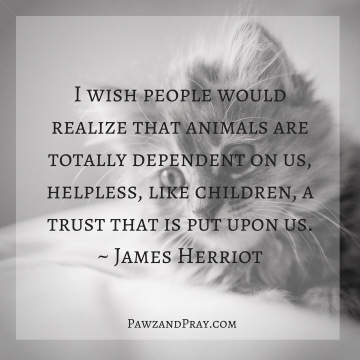 “I wish people would realize that animals are totally dependent on us, helpless, like children, a trust that is put upon us.” ~ James Herriot